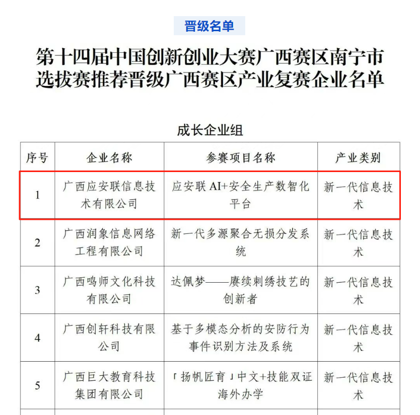“应安联AI+安全生产数智化平台”项目成功晋级第十四届中国创新创业大赛广西赛区暨2025年广西创新创业大赛产业复赛,成为47家成长组企业、19家初创组企业项目的新一代信息技术领域代表。大赛广西赛区南宁市选拔赛共计吸引300余家企业报名参赛,经组织专家对参赛项目进行现场分组评审,按照南宁市选拔赛企业数量比例和成绩由高至低排序,综合企业尽职调查情况,大赛组委会形成推荐入围名单。